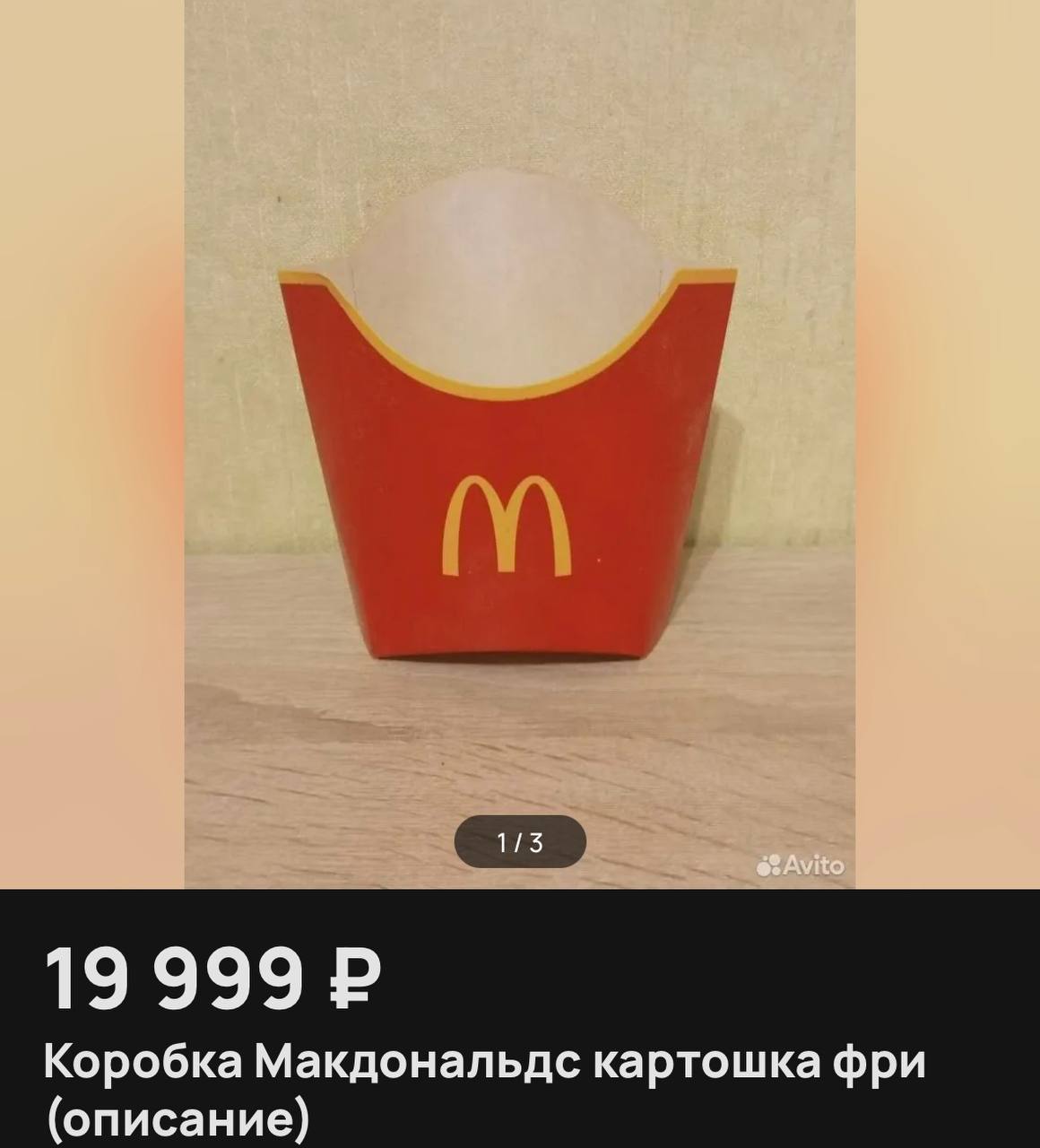 На этот раз мы нашли объявления о продаже влажной салфетки за 15 000 рублей, упаковки от гамбургера за 500 рублей, коробки из-под картофеля фри за почти 20 000 рублей. Почти все в бывшем использовании.