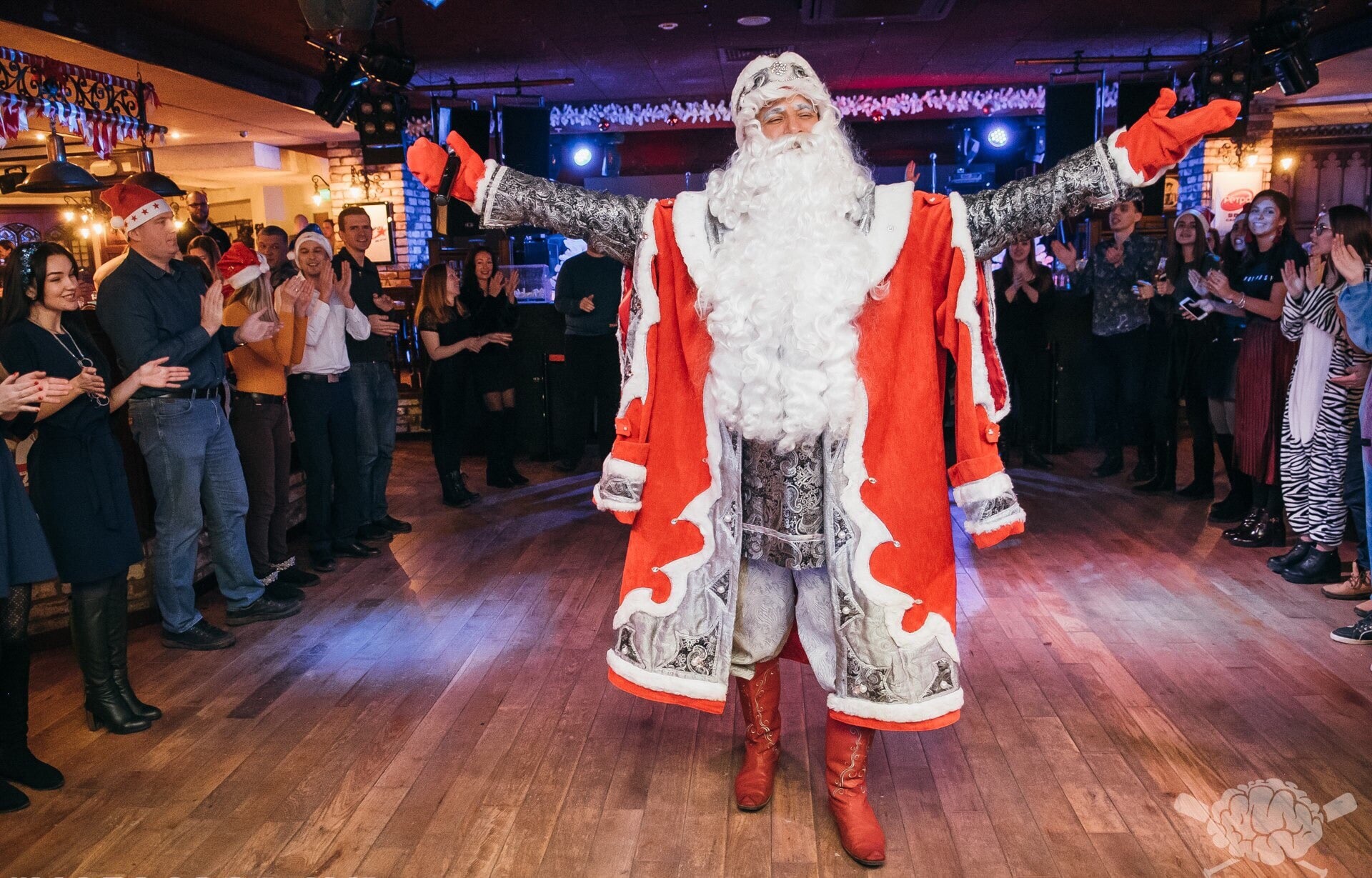 Однажды мы возвращались с одного заказа, спускаемся по лестнице в новостройке, потому что лифты были проблемными. В темном лестничном пролете услышали тревожный разговор: «Что же делать? Он лежит, мокрый...». Что-то такое. Понимаем, что нас ждет страшное событие. Спускаемся и видим, что там лежит пьяный Дед Мороз. Я абсолютный трезвенник, а там был вот такой. Видимо, он шел, шел и не дошел. Люди попросили нас выручить, ну мы и зашли поздравить. Потом они стали обращаться к нам.