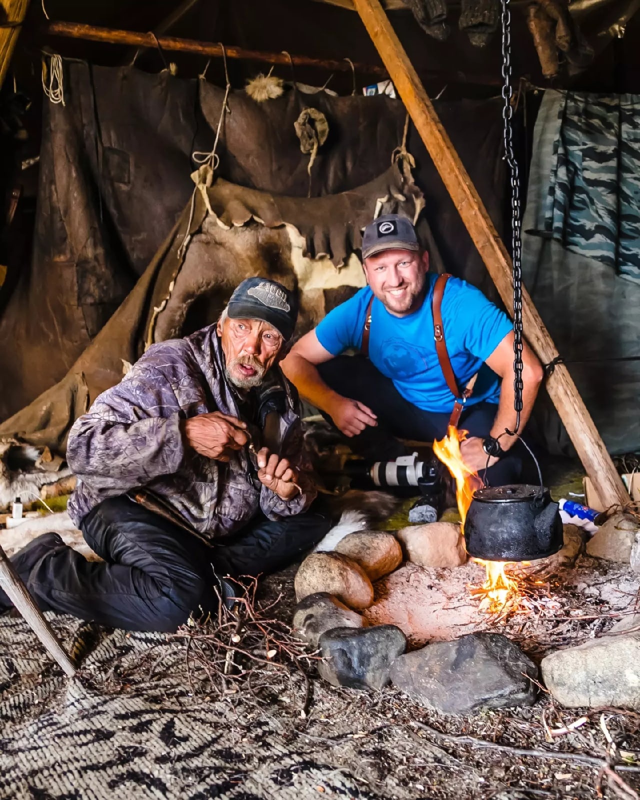 Во второй раз Алексею повезло. Вместе с командой они онашли стоянку большой семьи, которая живет в нескольких ярангах. Внутри них огонь разводится прямо по середине под дымовым отверстием. Ближе к стенам подвешиваются пологи из оленьих шкур, в них люди и ночуют.