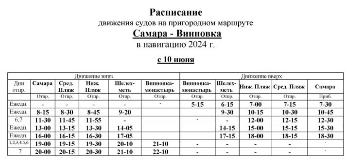 Добраться до Винновки можно от речного вокзала в Самаре по расписанию, представленному ниже. Стоимость поездки составит примерно 150 рублей в одну сторону для взрослого человека.