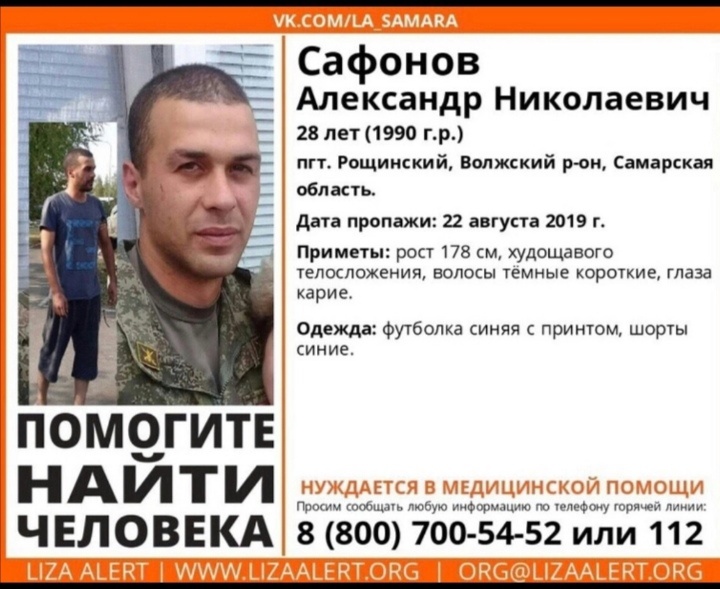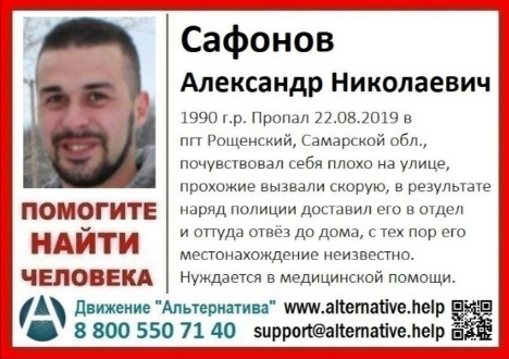 Движение "Альтернатива", которое занимается освобождением людей из разных видов рабства, опубликовало ориентировку со следующей информацией: "Сафонов Александр Николаевич пропал 22.08.2019 в пгт Рощинский, Самарской области. Почувствовал себя плохо на улице, прохожие вызвали скорую, в результате наряд полиции доставил его в отдел и оттуда отвёз до дома, с тех пор его местонахождение неизвестно".