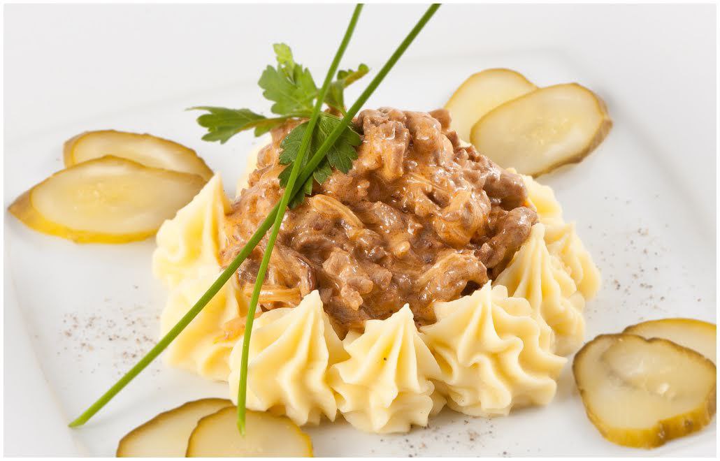 Говядину обжариваем до золотистой корочки, добавляем туда репчатый лук, соль, перец и любимые специи. Нарезанные соломкой шампиньоны перемешиваем с мясом и тушим около 2-3 минут. Тушить можно с водой или молоком. Как увидели, что говядина готова — мы добавляем сливки. Важно, чтобы перед этим испарилась вся вода. Тушим еще 6-7 минут до загустения сливок.