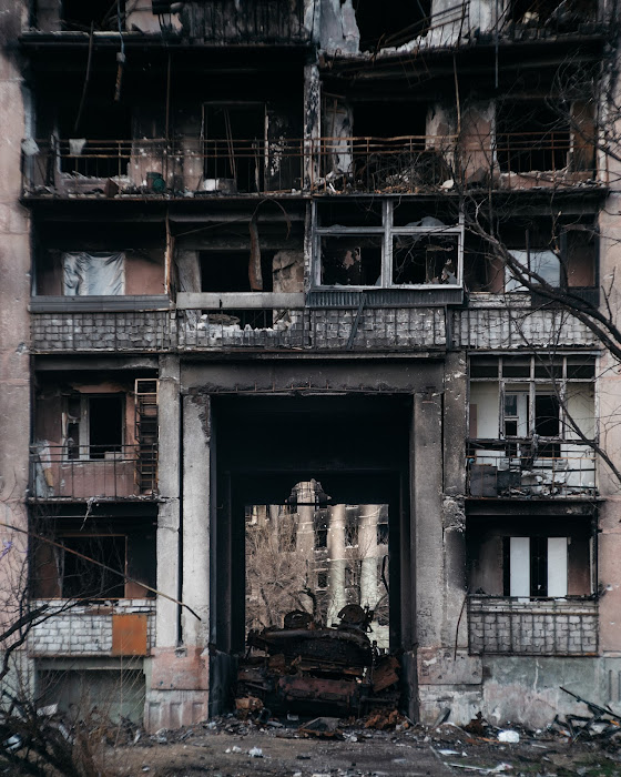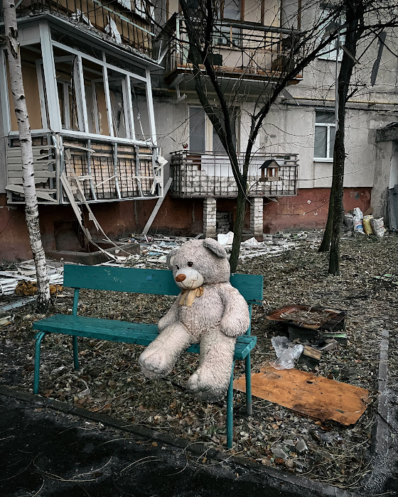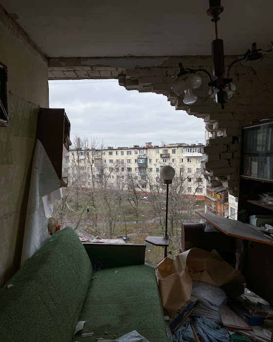 Новые детские площадки на фоне разрушенных многоэтажек, грязные плюшевые игрушки на улицах и бродячие собаки - так выглядит Северодонецк сейчас. Где-то в асфальте застряли осколки снарядов, а где-то среди разрушенных стен домов виднеются следы былой жизни. С улицы в одной из квартир можно разглядеть зеленый диван, старый сервант с книгами, напольную лампу, деревянный буфет с перебитой посудой и темно-оранжевые обои. Всё это когда-то было частью чьей-то повседневности. От ветра лишь колышется советская люстра. Свет в этих квартирах больше не горит, сейчас его некому зажигать.