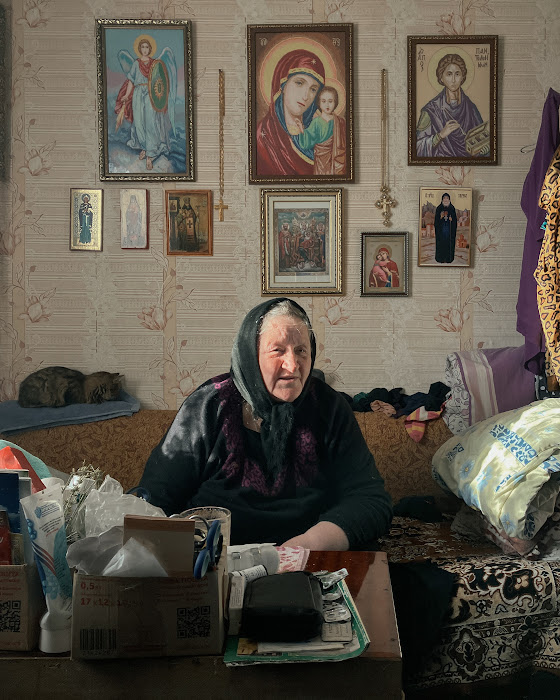 Одна из фотографий, сделанная Арсением, по-настоящему цепляет. На ней бабушка в изумрудном платке сидит на диване с наверняка еще советским покрывалом, а позади на стене висят девять икон. На спинке дивана спит преданный друг пожилой женщины - домашний кот. Это настоятельница женского монастыря, Белогорской Богоявленской обители.