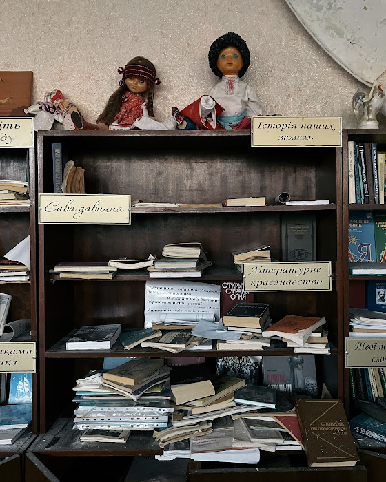 Кстати, о книгах. Арсений сфотографировал местную школьную библиотеку. На кадре старый сервант с разбросанными от взрывов книгами. Сверху на полках лежат почерневшие и никому не нужные куклы.