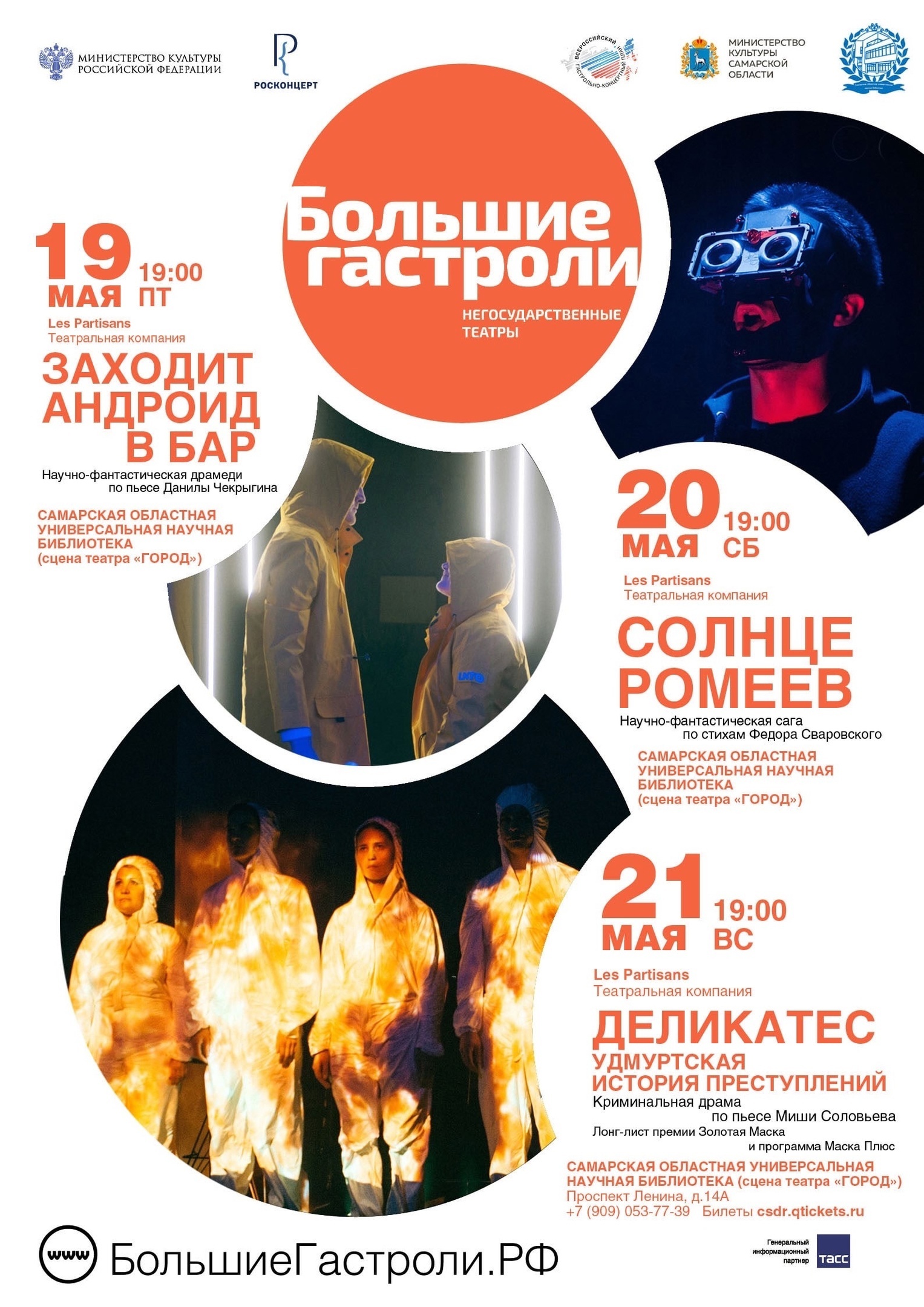 "Партизаны" выступят на сцене театра "Город" в Самарской областной библиотеке с 19 по 21 мая. Жители увидят три спектакля: "Заходит андроид в бар", "Солнце ромеев", "Деликатес. Удмуртская история преступлений". Я же говорила, что названия весьма интересные:)