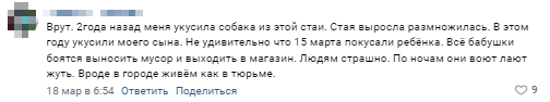 - Врут. Два года года назад меня укусила собака из этой стаи. Стая выросла, размножилась. В этом году укусили моего сына. Не удивительно, что 15 марта покусали ребёнка. Все бабушки боятся выносить мусор и выходить в магазин. Людям страшно. По ночам они воют, лают. Жуть. Вроде в городе живём, а как в тюрьме, - сообщает Светлана.