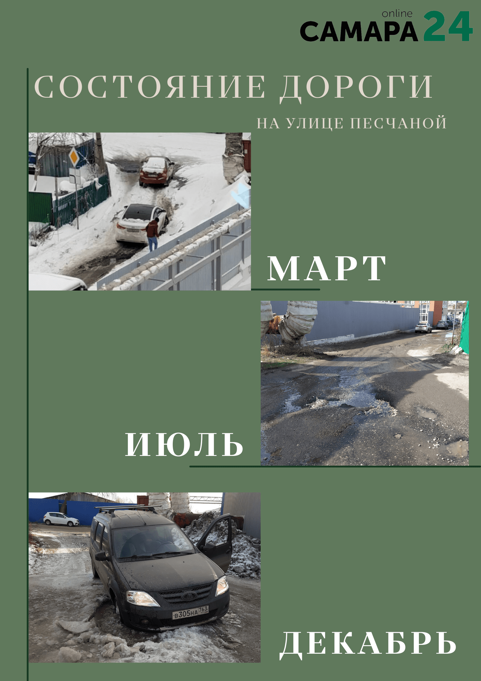Ольга Илингина предоставила редакции SAMARAONLINE24 фотографии затопленной улицы в хронологическом порядке по сезонам. Сначала показана дорога в марте этого года, далее - в июле, а после - текущеее состоянии Песчаной.