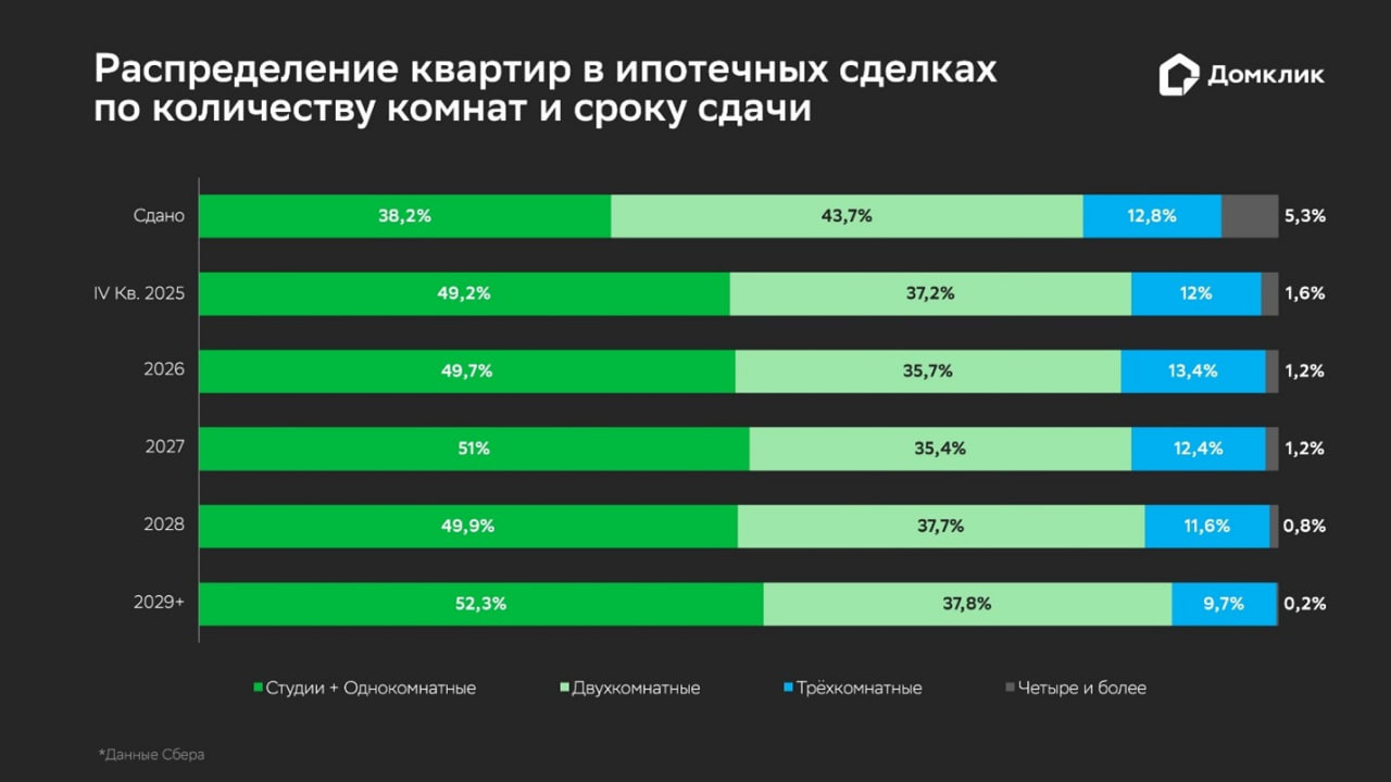 Количество комнат в ипотечных квартирах нередко связано со сроком сдачи новостройки. Однокомнатные лоты и студии практически одинаково часто покупают на любом сроке строительства. Их доля максимальна в сделках, где срок сдачи после 2029 года включительно – 52,3%. Однако реже всего такие объекты приобретаются в уже сданных домах – только 38,2% ипотечных сделок. Это связано с тем, что большинство доступных объектов берут на старте по низкой цене и спрос на них изначально выше.