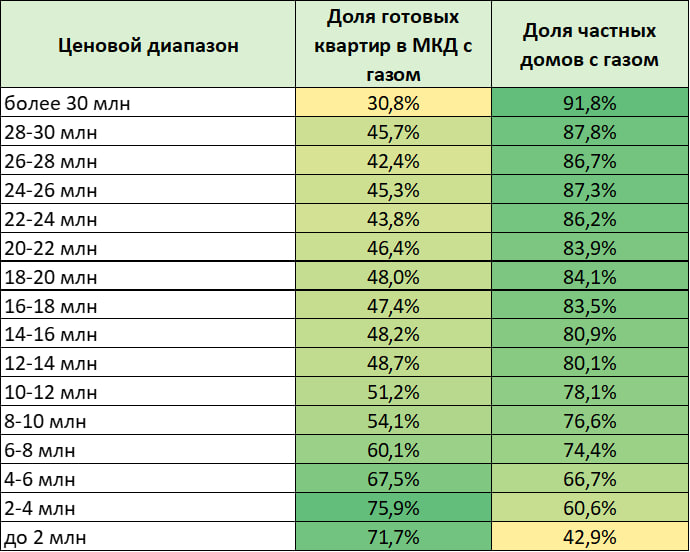 На данный момент на российском рынке недвижимости сложилась ситуация, когда загородные дома, выставленные на продажу чаще газифицированы, чем вторичная недвижимость, находящаяся в многоквартирных домах (МКД). Среди частных домов и таунхаусов доля с подведенными газовыми коммуникациями достигла 71%, а на рынке вторичной недвижимости в МКД – 63,4%.