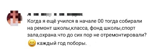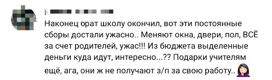 Любопытно про наличие родительских сборов денег на нужды класса, на ремонт, на подарки. В каждой школе так или иначе родительский комитет собирает немалые суммы, и для многих семей это серьезная статья затрат. Что думают люди?