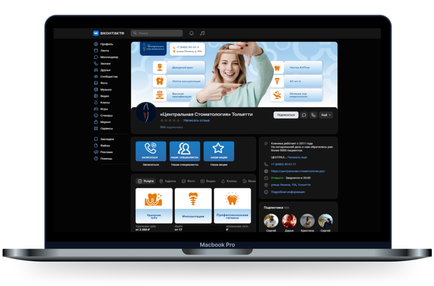 Группа ВКонтакте была оформлена в едином фирменном стиле: привлекательная обложка, информативное описание клиники, удобные карточки с основными услугами и настроенные виджеты для комфортного взаимодействия с пользователями.