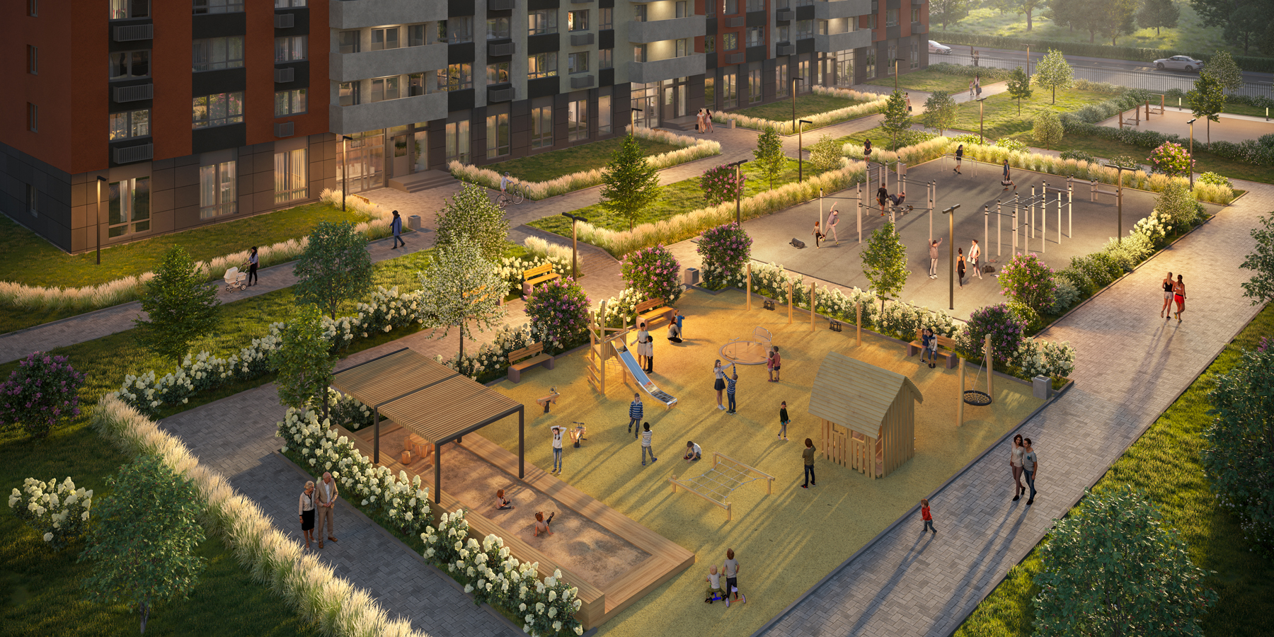 - Двор без машин с ландшафтным озеленением, площадками для отдыха и игр.