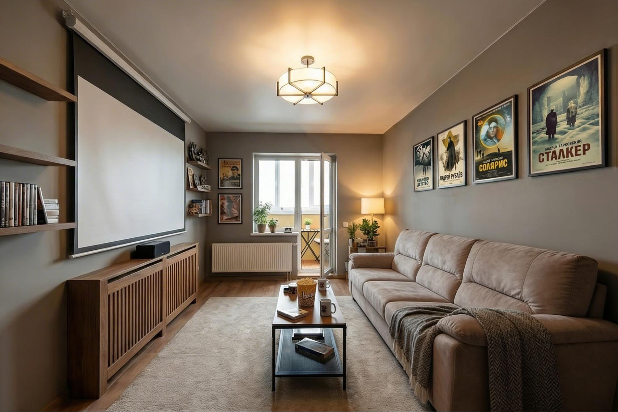 - В освободившейся комнате размещаем домашний кинотеатр: проекционный экран на всю стену, удобный диван, приглушенный свет. Им могут пользоваться все члены семьи. В итоге, у нас получается место, куда можно позвать друзей, не занимая общие зоны.