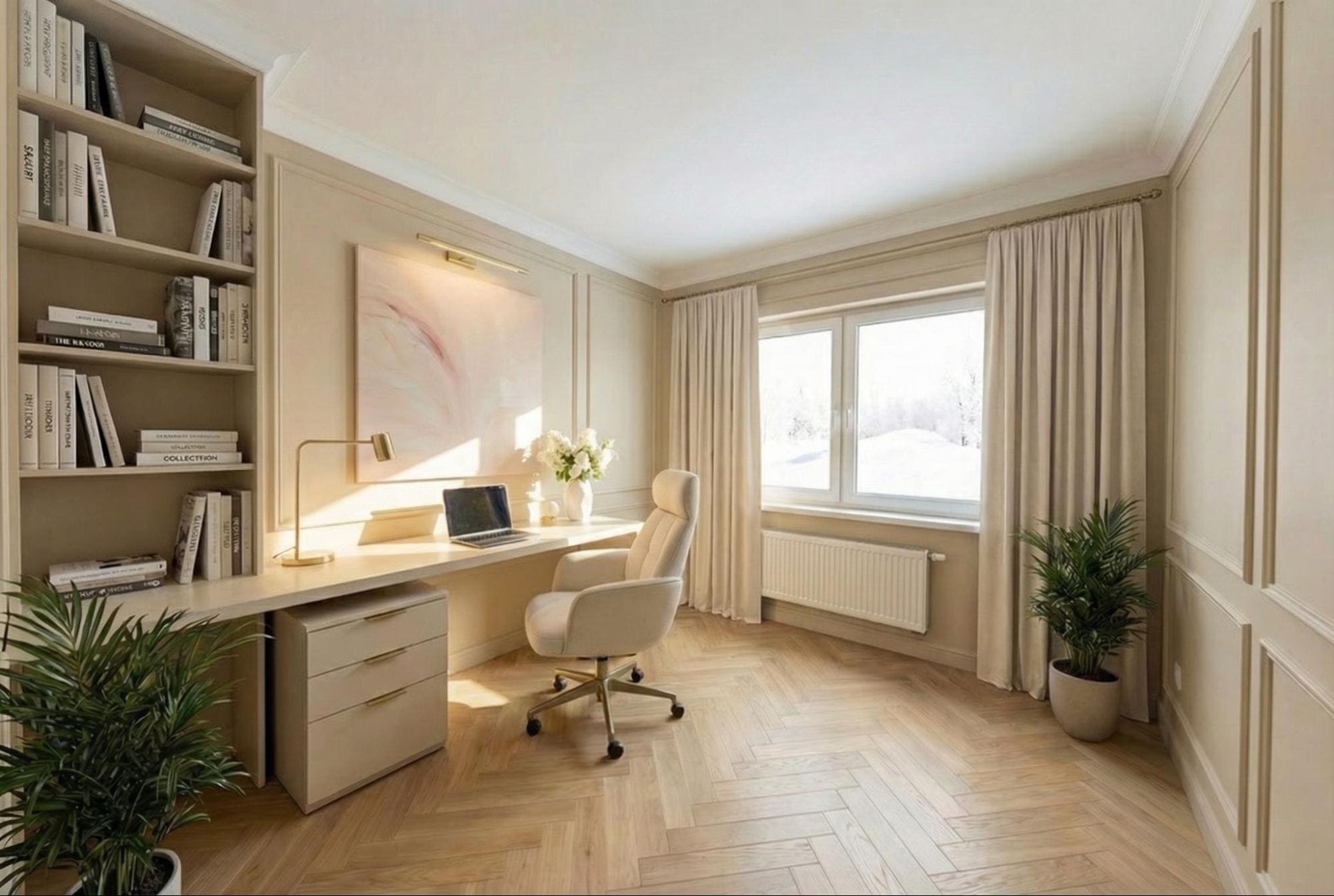 - Две комнаты отдаем полностью под домашний кабинет: встроенные стеллажи, удобный стол у окна, хорошее естественное освещение.