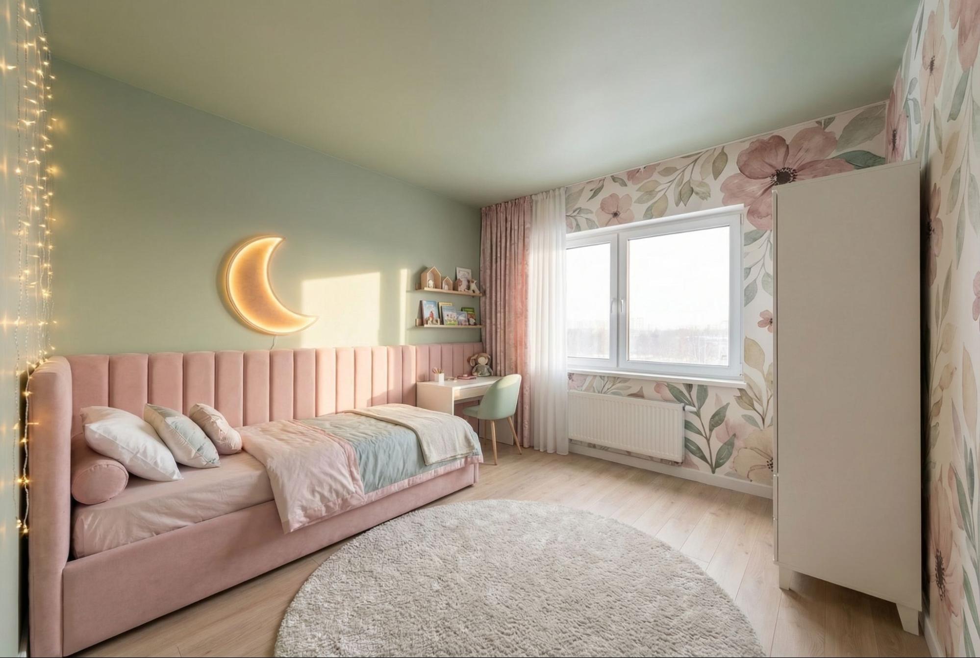 — В этом возрасте дети сидят за компьютером часами, — говорит Ксения, — При такой расстановке мебели окно даёт достаточно естественного света для рабочего стола. Встроенные полки по бокам от окна закрывают потребность в хранении книг, колонок, фигурок — всего того, что неизбежно накапливается у детей.