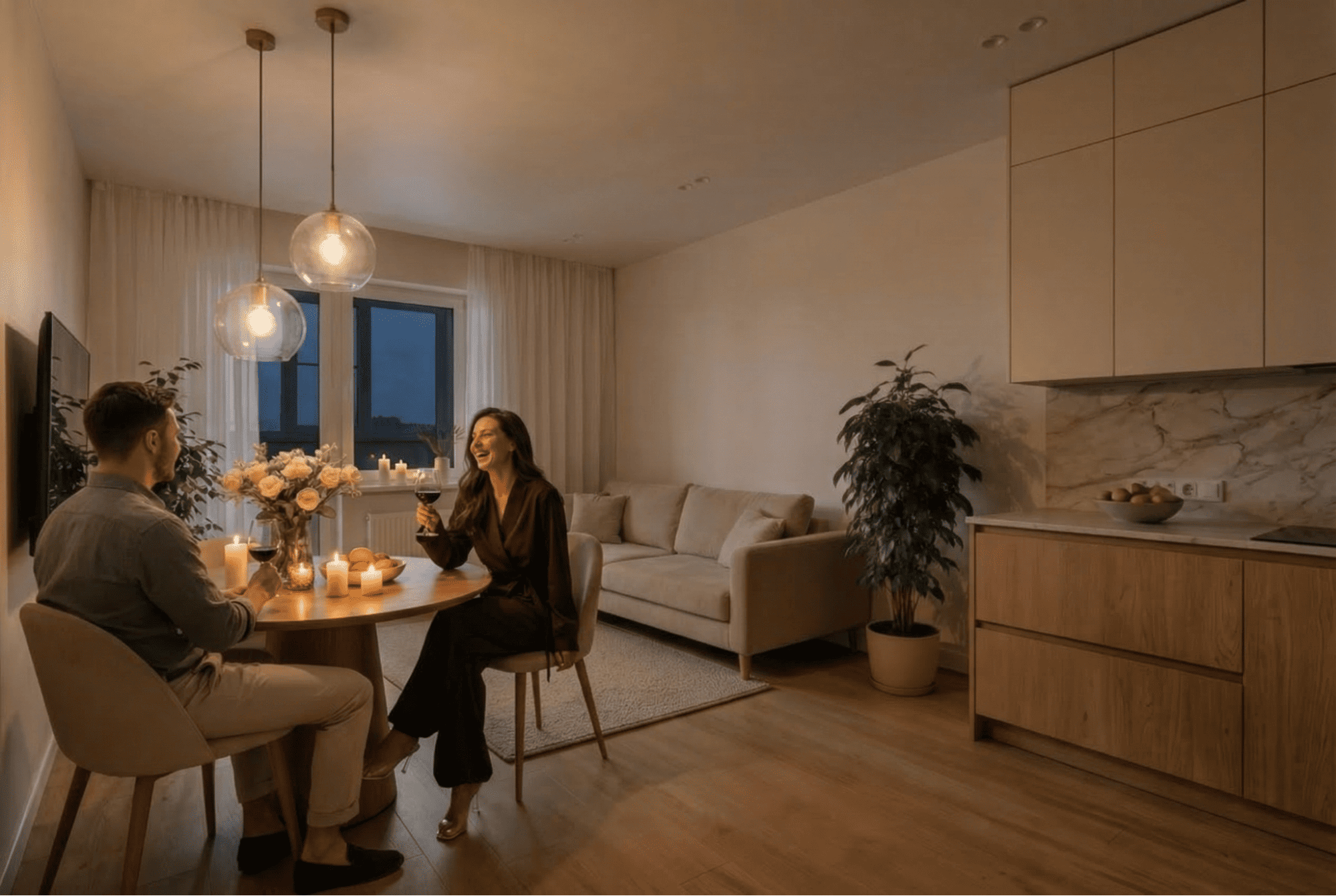 - Кухня в этом сценарии превращается в зону переключения. Вечером та же кухня-гостиная работает совершенно иначе: свечи, бокал вина, приглушенный свет от подвесных ламп. Одно и то же помещение утром и вечером создает совершенно разную атмосферу — именно за счёт сценариев освещения.