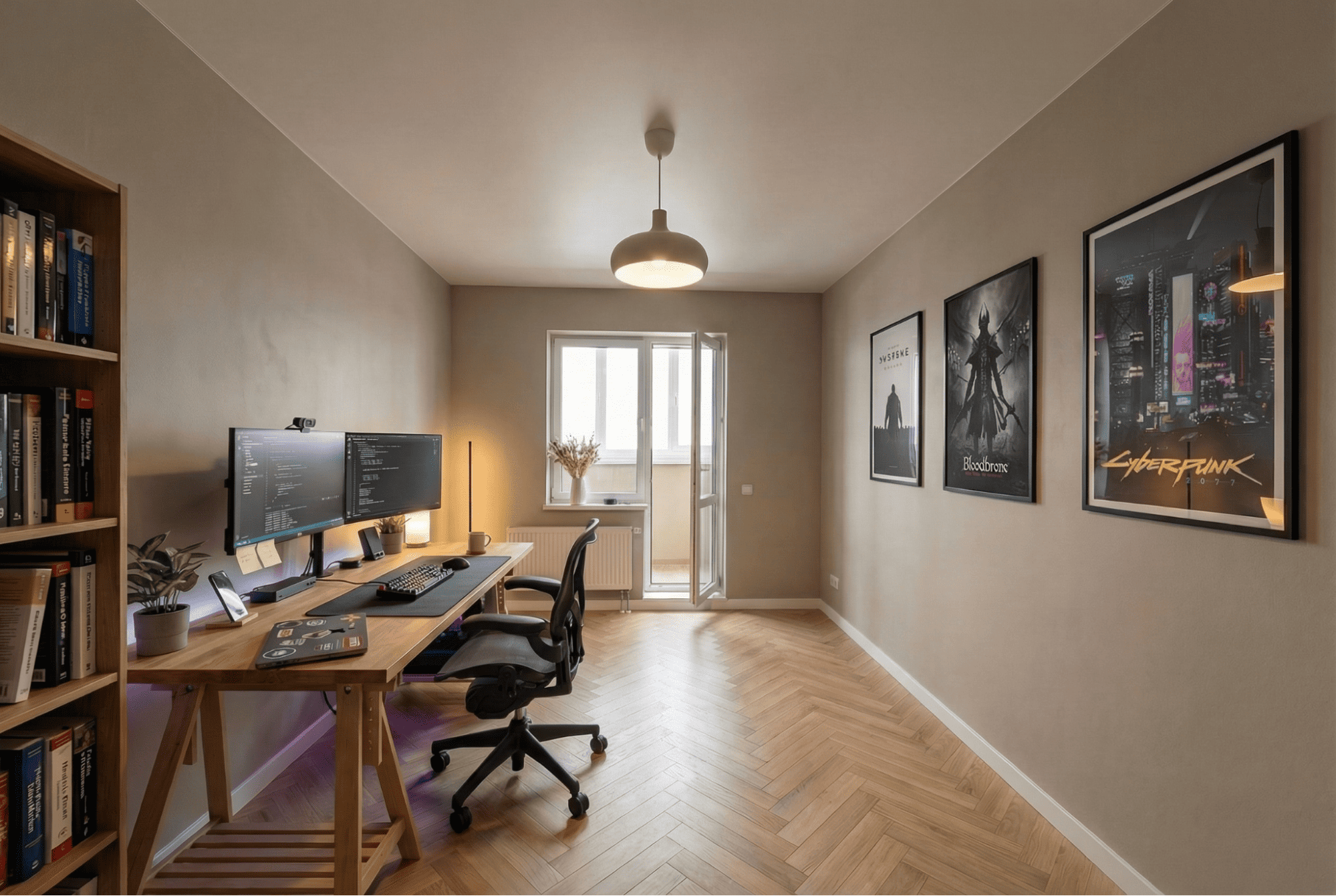 - Освещение — направленный точечный свет над столом плюс торшер в углу для работы в вечернее время.
