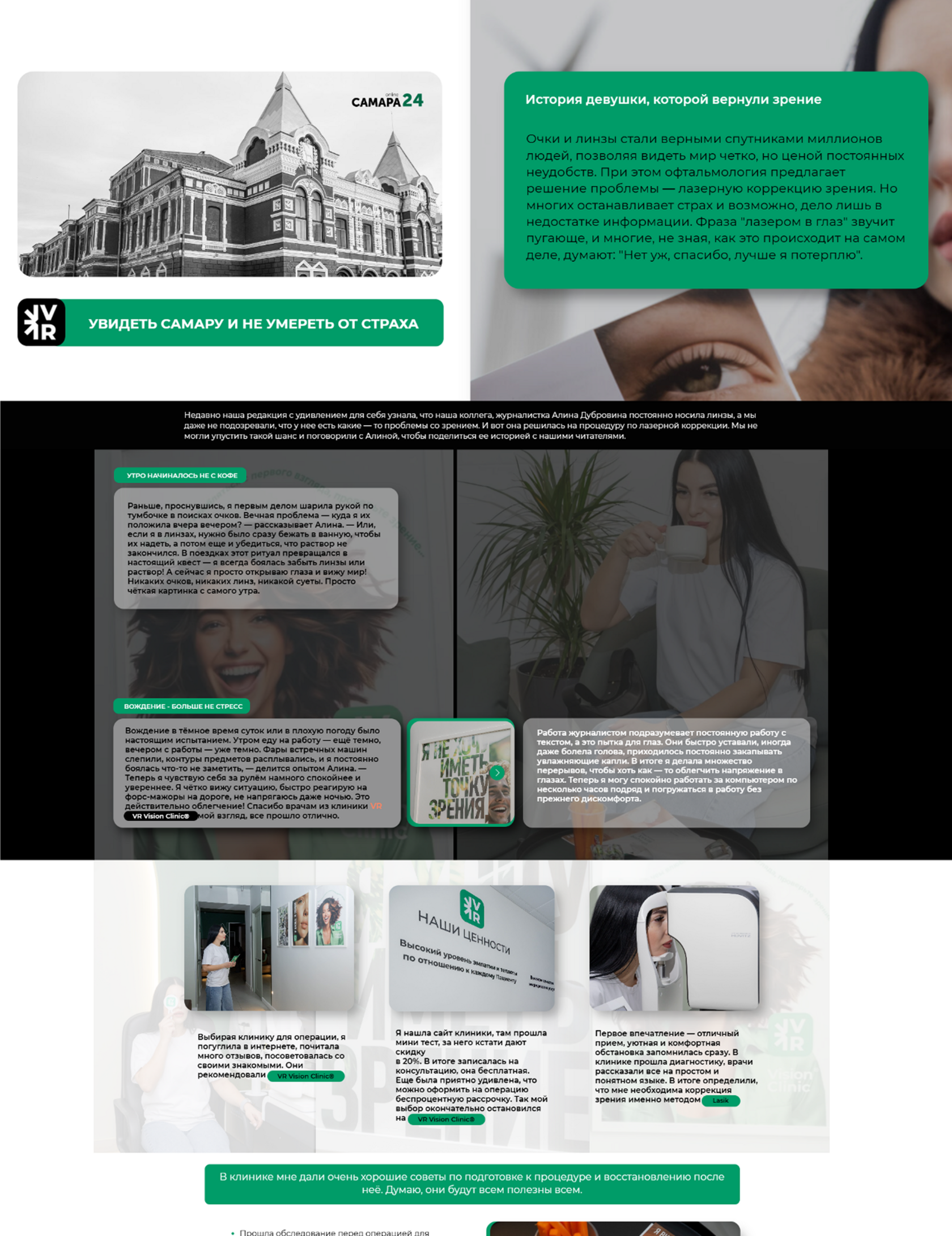 Рассказываем о личном опыте коррекции зрения журналистки Алины Дубровиной, где через эмоциональную историю и детали операции продвигаем клинику VR Vision Clinic. В тексте сочетаем личный рассказ, полезные рекомендации и визуальные «до и после», создавая доверие и мотивируя записаться на консультацию.