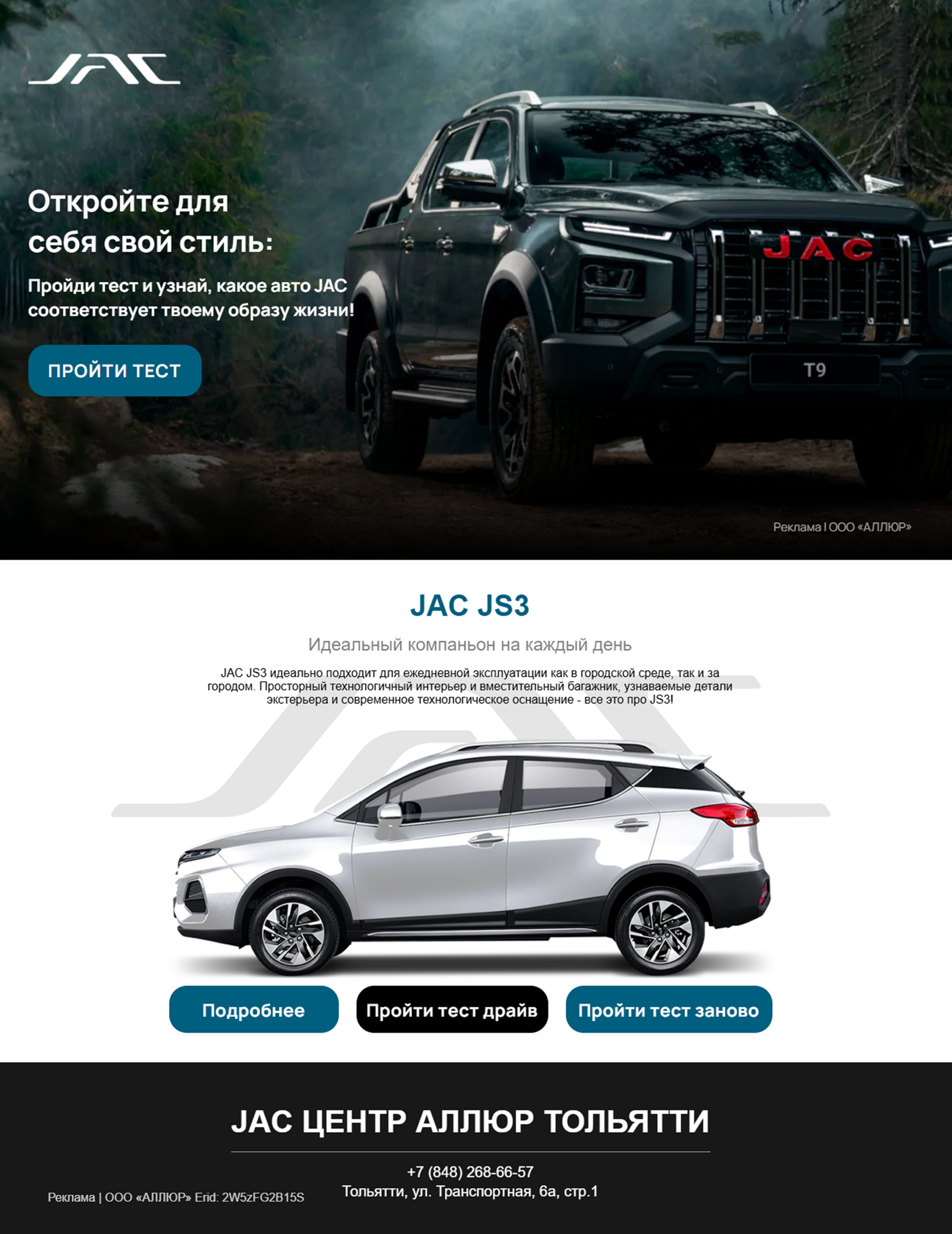 Разработали интерактивный тест, который подбирает автомобиль JAC под стиль жизни пользователя, органично продвигая бренд. В увлекательной форме пользователи получают персональные рекомендации, узнают детали о моделях и могут записаться на тест-драйв.
