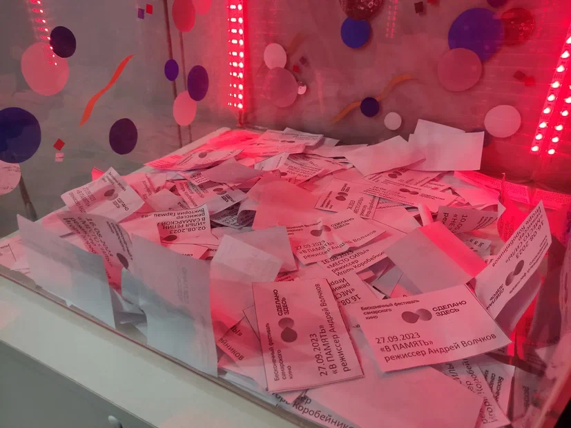 В конце обсуждения все зрители пускали в прозрачную урну те самые "билеты", раздававшиеся при входе. Таким образом, они отдавали голоса за работу Волчкова, чтобы она вошла в альманах фестиваля "Сделано здесь".