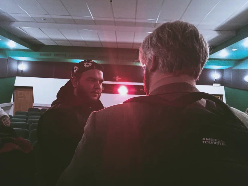 Фото: режиссёр Андрей Волчков (справа) общается со зрителями перед показом / Даниил Мурзов
