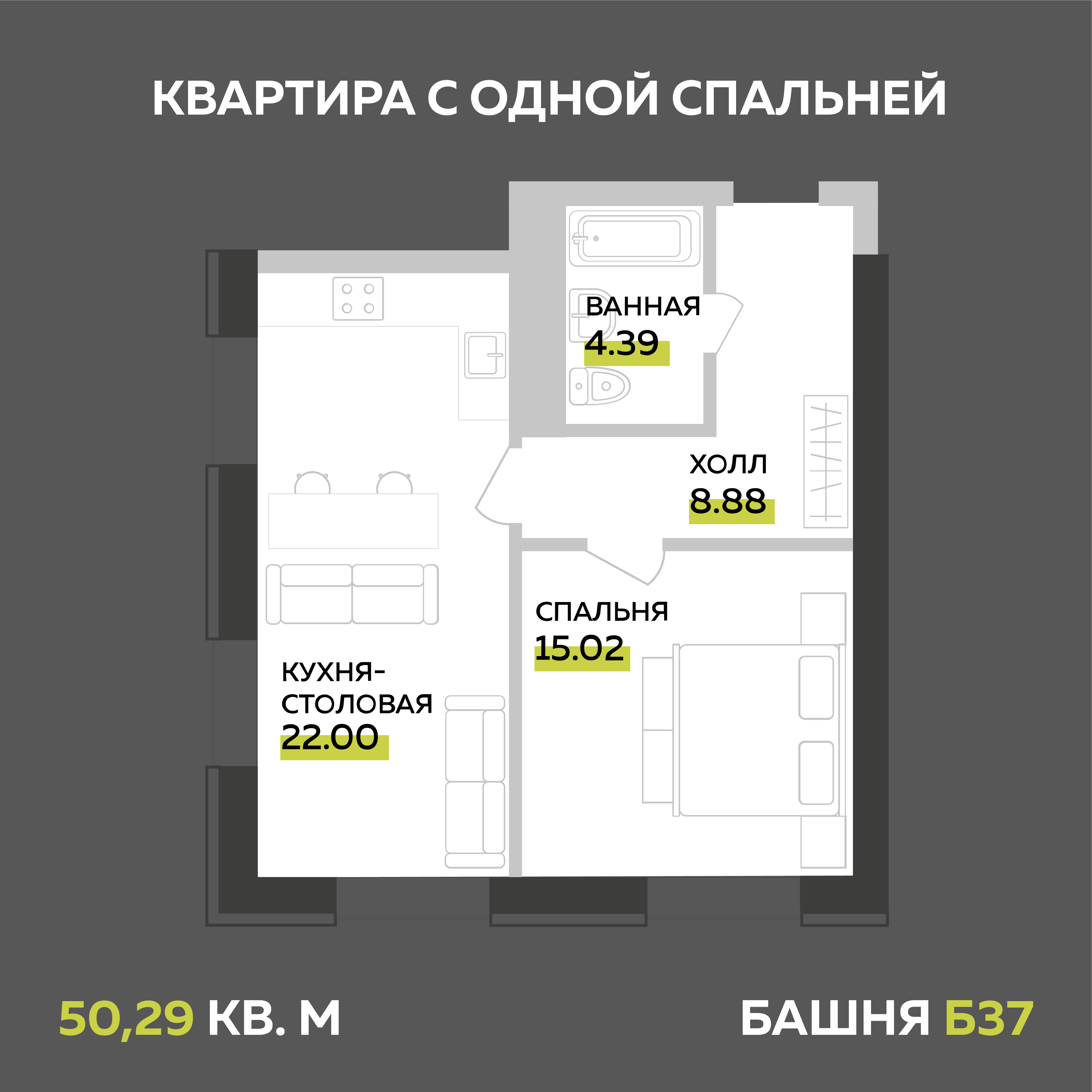 Вот, например, элегантная, эргономичная квартира с одной спальней и просторной кухней - гостиной в башне Б37. В продаже сейчас всего 2 такие квартиры на 23 и 32 этажах.