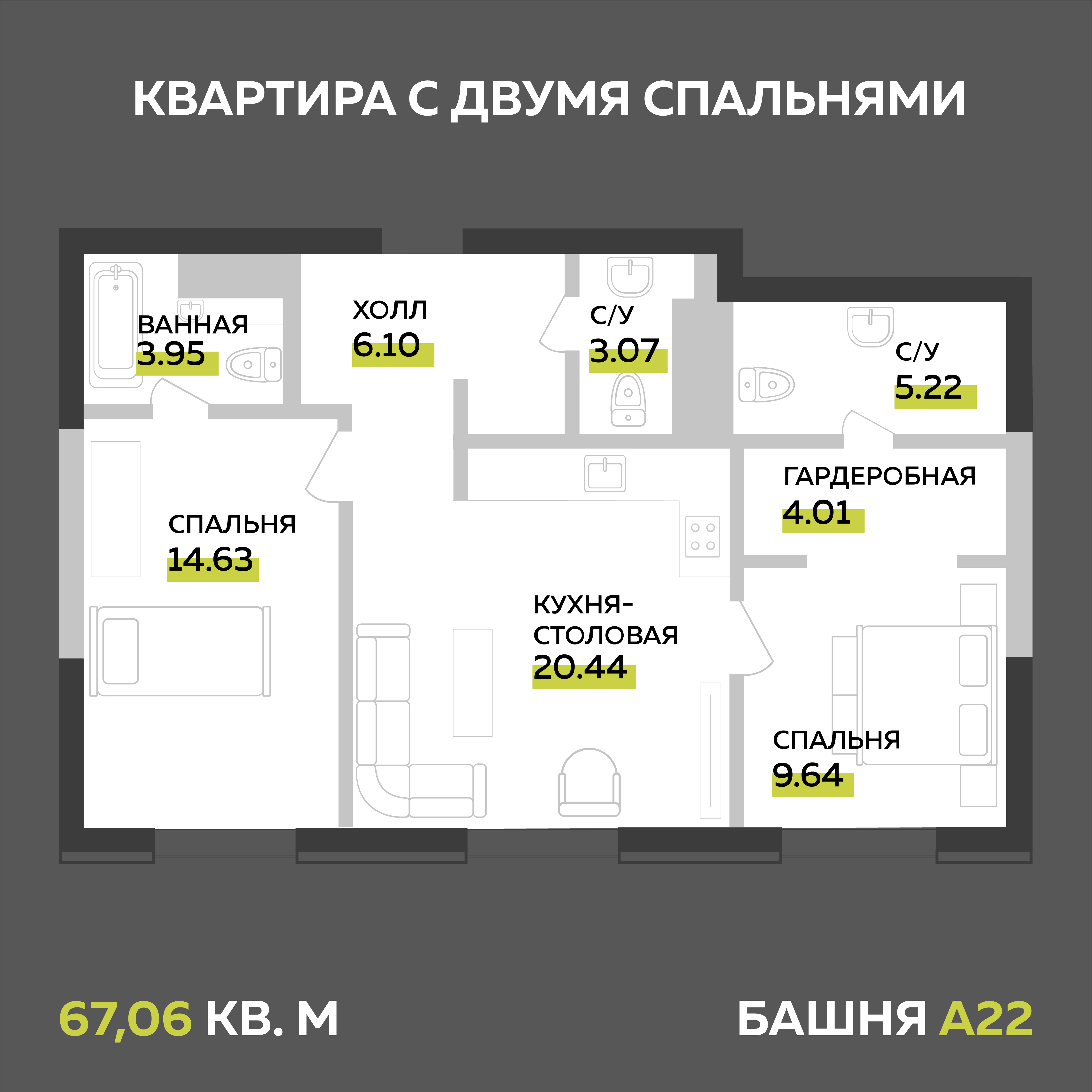 Оптимальным вариантом для жизни и инвестирования станет уникальная квартира в башне А22 с двумя изолированными спальнями и тремя санузлами. Здесь учтены все нюансы для комфортной жизни и абсолютно разных сценариев жизни. Благодаря продуманной планировке с четким зонированием вся площадь квартиры остается полезной. Просторная кухня-гостиная посередине разделяет спальни и делает их максимально приватными, а сразу две мастер-спальни с собственным санузлом – эксклюзив, который крайне редко встречается в планировочных решениях.