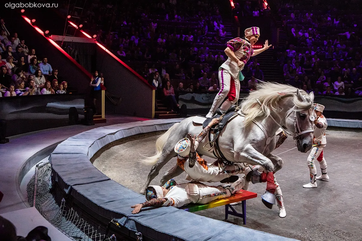 На манеж вышли Заслуженная артистка России, обладатель серебряной награды на международном фестивале Идол, обладатель национальной премии цирк Виолетта Александрова-Серж и ее партнеры Сергей Марков и Михаил Вишняков, которые поставили уникальный групповой трюк в джигитовке с преодолением препятствия. Всадница на спине лошади в положении стоя на двух ногах и другим джигитом под животом четвероногого артиста, скачущего галопом, преодолевают лавку, на которой лежит человек.