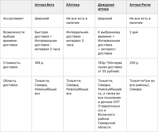 У Аптеки Вита есть доставка “как можно скорее” без указания сколько это по времени, и интервальная доставка в промежутке 2 часов. Для меня это не очень удобно т.к. непонятно сколько по времени придется ждать курьера 30 минут или 3 часа. К тому же, они не доставляют на дачи.