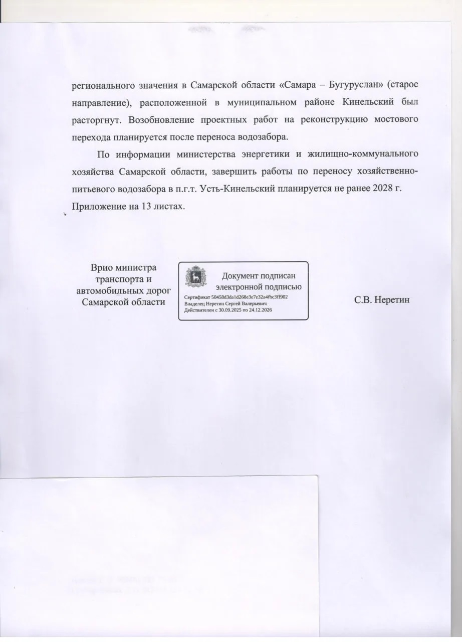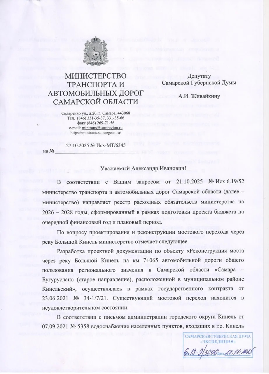 Депутат Александр Живайкин выразил недовольство ответом Министерства транспорта Самарской области по ремонту моста через реку Большой Кинель в поселке Усть-Кинельский. Об этом он сообщил в своем Telegram-канале.