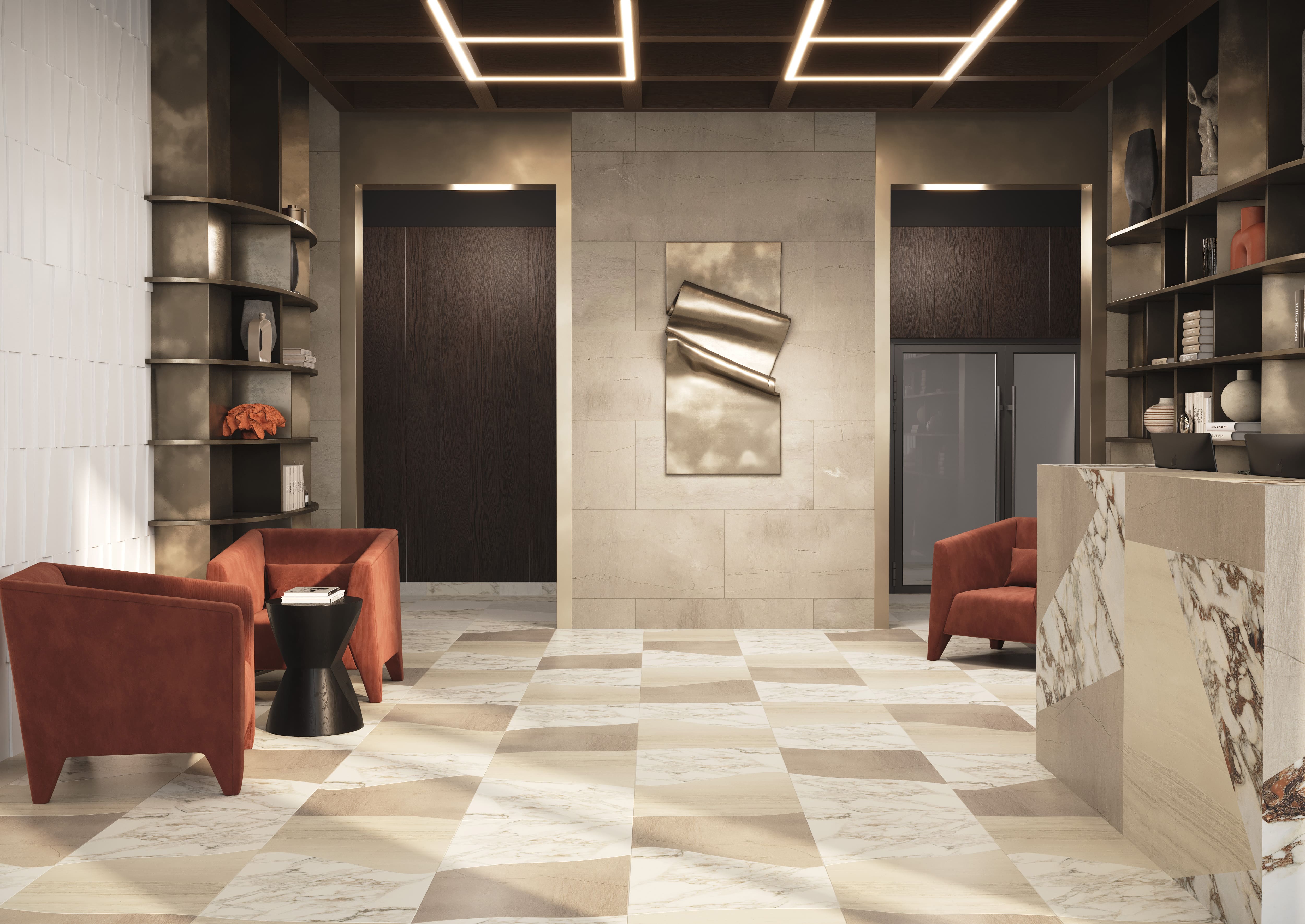 Создать в холле уютную атмосферу гостиной помогают предметы искусства и мягкие зоны. Стены вестибюля Дома Кино украшены массивными плитами керамогранита и стильными панелями, а на полу выложено панно из керамогранита, текстурированного породами светлого мрамора Calacatta, Statuario и Carrara (Калакатта, Статуарио и Каррара).