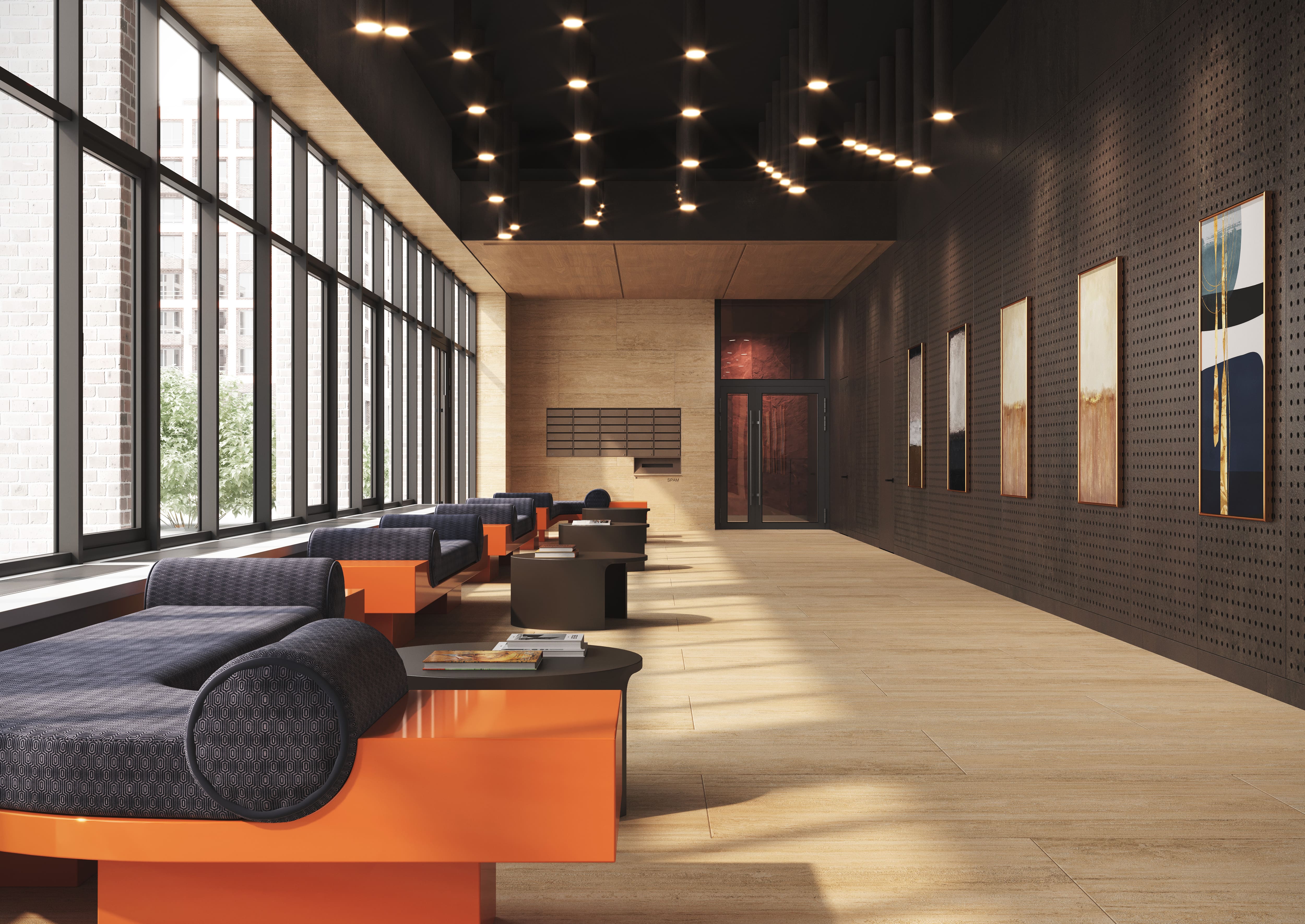 Роль основных материалов в интерьере Дома Искусств архитекторы «ЗИМ Галереи» доверили травертину и покрытой бархатистой ржавчиной стали Forcera (Форсера). Поэтому самая длинная стена в пространстве вестибюля «одета» в атмосферную текстуру «ржавой» стали, а перфорированные стальные кассеты служат идеальным фоном для экспозиции предметов современного художественного искусства. Отдельного упоминания заслуживает освещение вестибюля: инсталляция каскадных рядов труб разных размеров со встроенными акцентными светильниками, вносит динамику в строгий линейный интерьер и подчеркивает контраст модерновой холодной матовости нержавеющей стали и традиционного тёплого травертина в отделке лифтовых холлов.